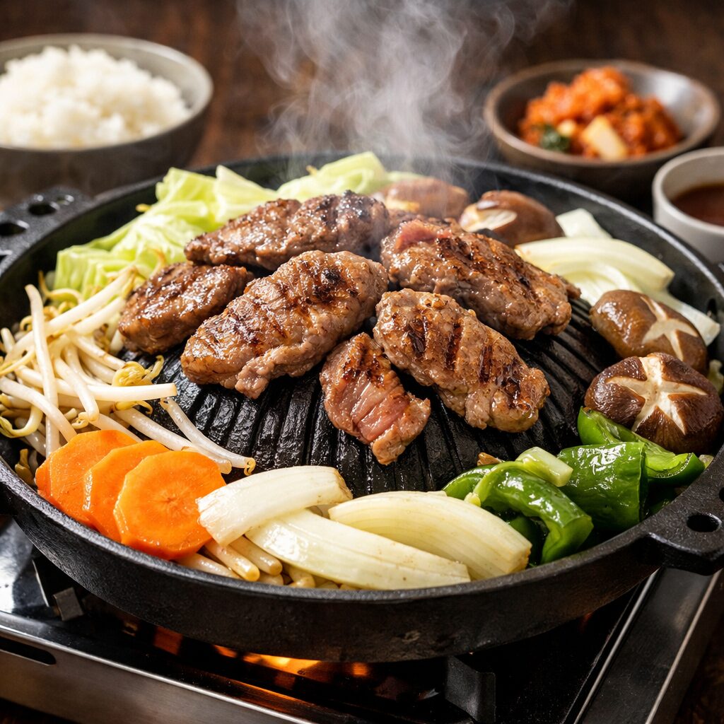 肉だけを急いで焼かず、最初に野菜を広げることで、満腹感とカロリー調整が同時にできます。